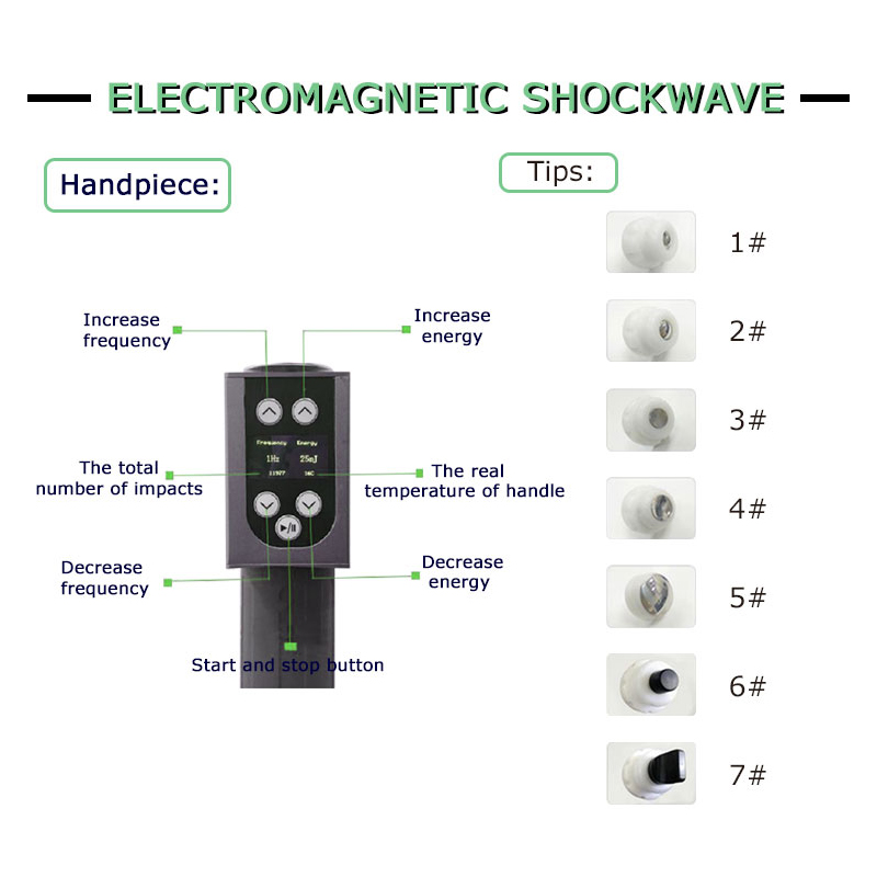 Shock wave handle with 7 different tips for different area use! handle can control the machine directly!