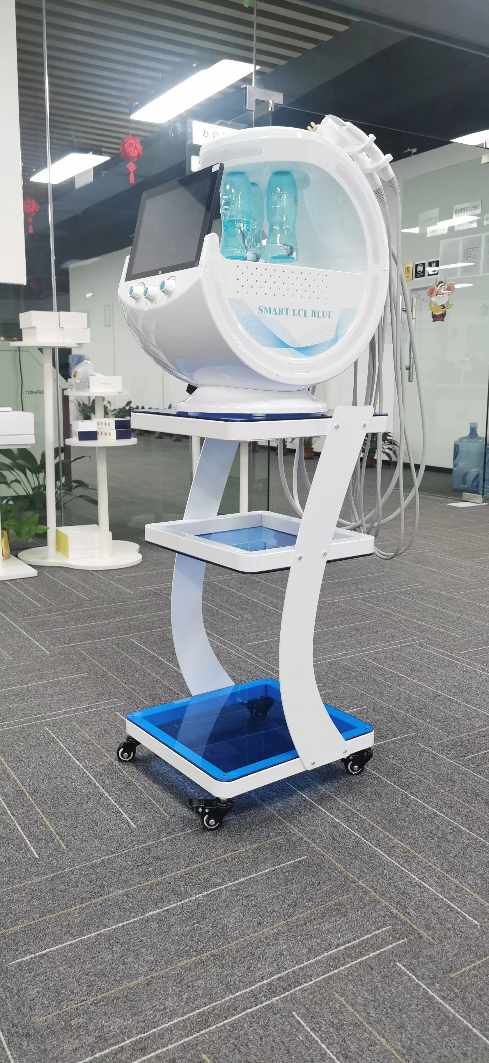 The intelligent ice blue skin management system is to collect facial skin detail images through a 10 million pixel high-definition micro-range camera combined with three-spectral imaging technology, through intelligent diagnosis and analysis of artificial intelligence core engine,8 dimension fine items to detect skin problems, and according to the diagnosis results of private customized beauty care program and intelligent recommendation of professional skin care products; Combined with the techniques of" ultrasonic shovel knife "," bubble "," nano atomization "," ultrasonic wave "," gold radio frequency "," ice repair "and so on, the six high configuration beauty functions comprehensively manage the skin, combine the results of AI skin diagnosis with skin care products and other skin care items, and develop multi-functional integrated equipment for skin detection and management.